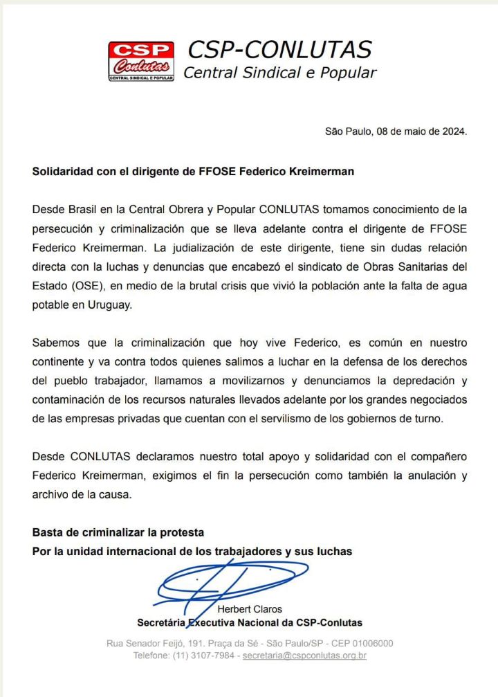 Solidaridad con Federico desde Brasil de la Central Obrera y Popular CONLUTAS